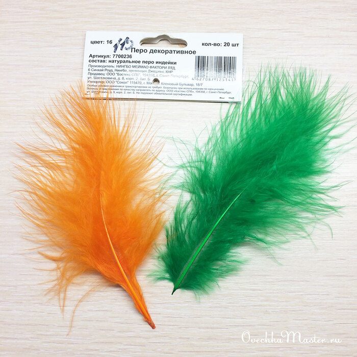 Все пришила прозрачными нитками, клюв предварительно еще приклеила с помощью прозрачного геля.Перья покупала давно, несколько лет назад. Натуральные перья индейки, такие пушистые и яркие! Их просто вставила в нужное место)))).
