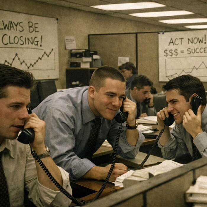 Каноническим фильмом, зафиксировавшим этот переход, стала «Бойлерная» (Бен Янгер, 2000), вышедшая на пике бума доткомов. Ее прототипом стали реальные брокерские конторы вроде «Stratton Oakmont», которые торговали «пенни стоками» — акциями компаний-пустышек. Цена этих бумаг двигалась не благодаря бизнесу, а исключительно за счет агрессивного холодного обзвона. Молодые парни в контекстных рубашках не анализировали рынок. Они впаривали акции по телефону, используя биржу как красивую картинку на стене. Торговый зал был заменен офисным open-space, а харизма Гекко низведена до заученных агрессивных скриптов.