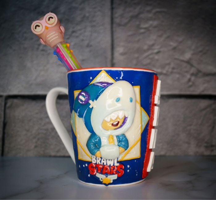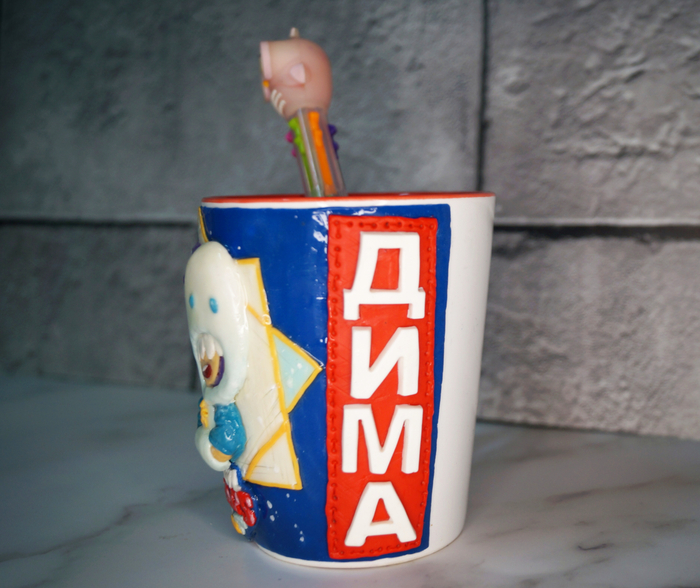 Декор на кружку вылеплен вручную с большой любовью!) материал декора: прочная полимерная глина. кружка 260мл. (Ручка просто рядом лежала. Яркая такая. Вот и засунула 😆)