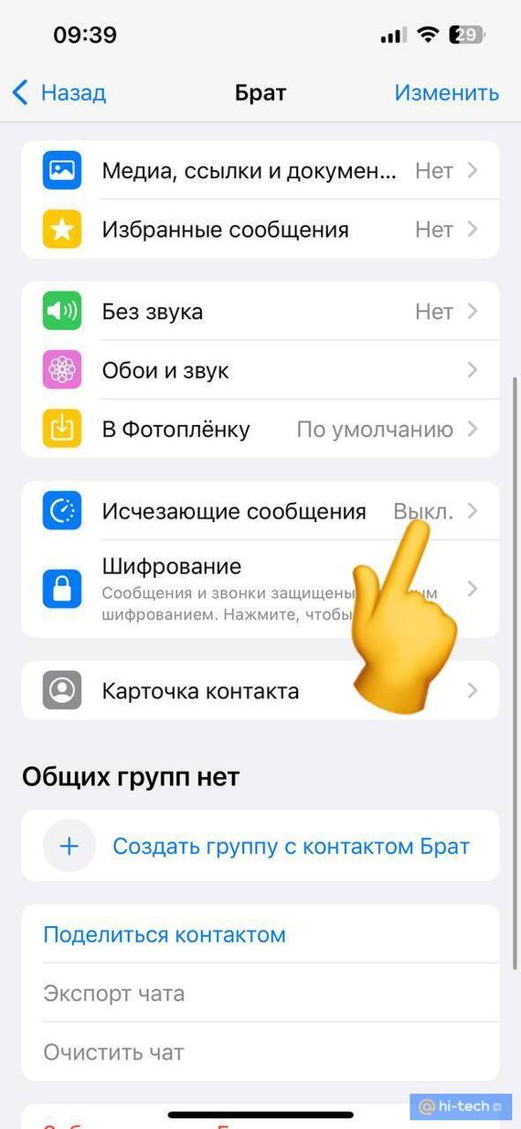 Перейдите в нужную переписку; Нажмите на контакт человека;Перейдите в раздел «Исчезающие сообщения»;Установите таймер.