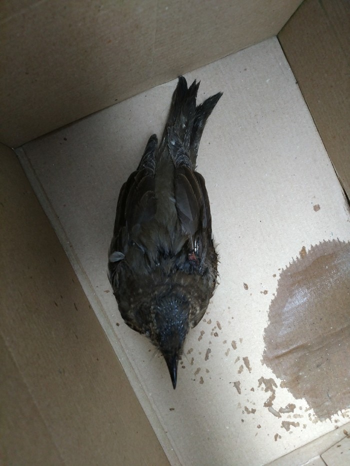 Птица залетела в расстояние между пленкой и стопкой стекла, сегодня очень жарко, сколько она там пробыла неизвестно. Была вытащена от туда, помещена в коробку, напоена и убрана в прохладное помещение.
