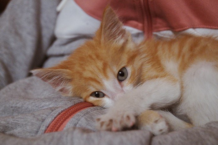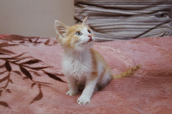 Котенок игривый. Ходит в лоток. Один пока то ли не может спать, то ли боится, так что когда устаёт сразу ищет место поближе к людям.