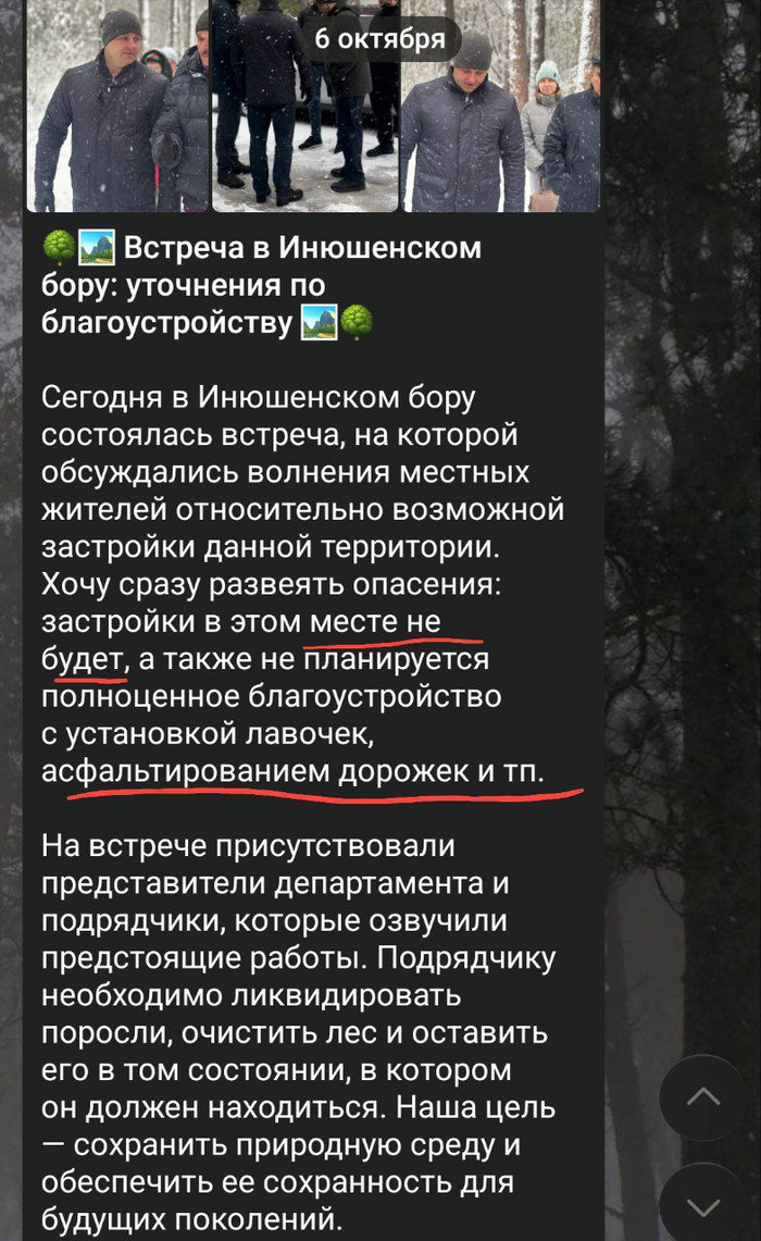 Тут ярко проскальзывает хроника лжи, например, анализируя посты в тг канале Гуща Р.А, 15 августа был выложен данный пост фактически подтверждающий победу народного выбора за сохранение бора, заверяя жителей в «минимальном вмешательстве» и «уборке только того, что мешает естественному развитию бора». Это было сказано на фоне уже принятого 22.08.2024 Постановления Мэрии о строительстве дороги