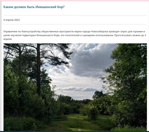 Так же, весной 2023 года была инициирована кампания по выбору дизайн-проекта в рамках нацпроекта и фактически, горожанам вновь предложили варианты благоустройства, которое бы неизбежно превратило бор в парк, но скорее всего эта идея провалилась, иначе не было бы и третьего голосования в 2024 году