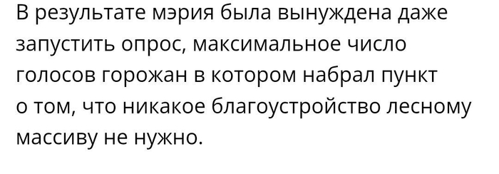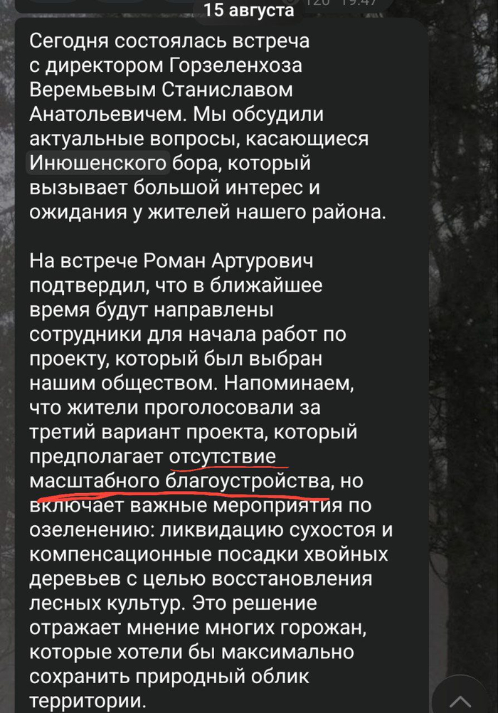 Еще в 2018 году была предпринята первая попытка навязать благоустройство с инфраструктурой, но этот проект провалился в ходе общественного голосования и не был реализован. Этот факт доказывает, что жители исторически против превращения бора в парк.