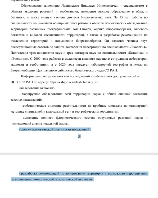 Далее, отдаленно начнем с официального отчета по натурному геоботаническому обследованию, проведенному д.б.н. Н. Н. Лащинским (Новосибирск, 2023 г.). Этот документ научно доказывает уникальность и экологическую значимость бора, но был цинично проигнорирован при принятии решений о вырубке.