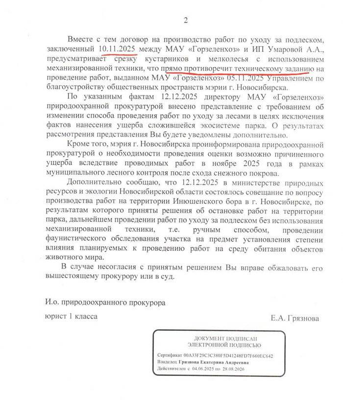Варварский характер проводимых работ был официально подтвержден надзорными органами. Исполняющий обязанности природоохранного прокурора Е.А. Грязнова в своем ответе от 12.12.2025 зафиксировала, что: