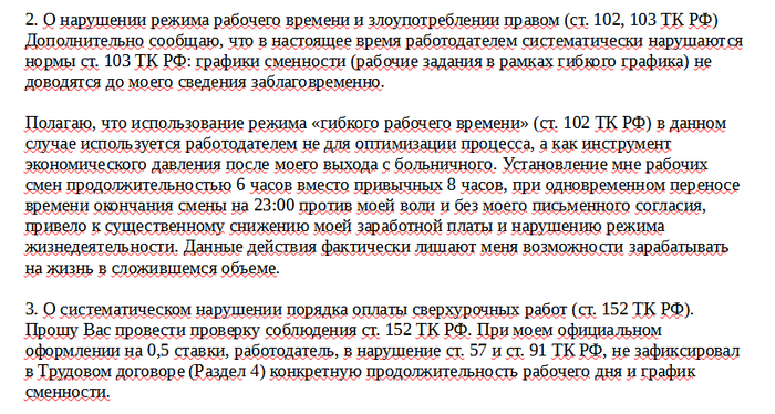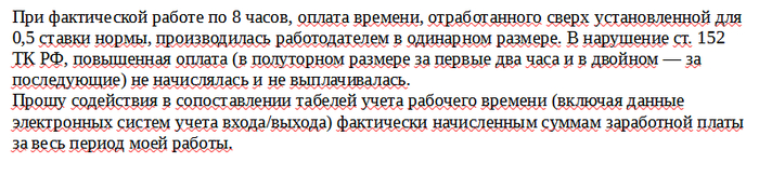1) Я указывала, что работала по 8 часов при оформлении на 0,5 ставки (в графике 2на2 — это 6 часов, и получала за часы сверх своей ставки одинарную оплату вместо полуторной и двойной в соответствии с законом.