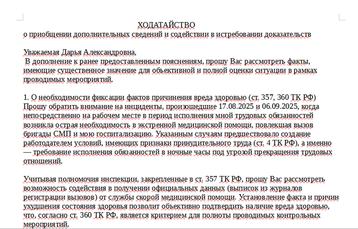 В своем Ходатайстве я прямо просила инспектора истребовать выписки из журналов скорой помощи от 17.08.2025 и 06.09.2025, когда мне вызывали бригаду врачей прямо на рабочее место. Ответ госпожи Зайцевой: