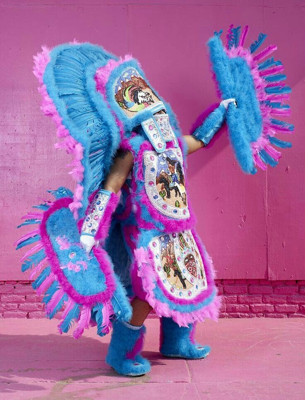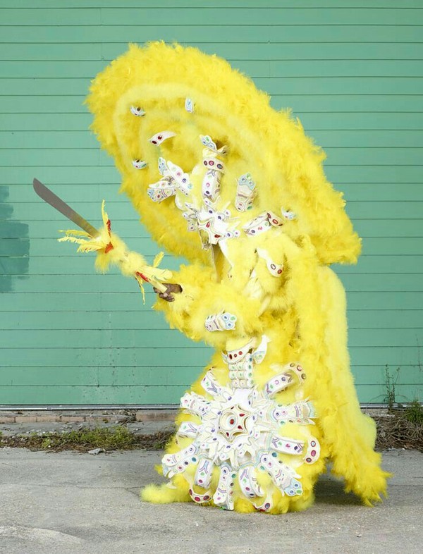 << Главный признак новоорлеанского индейца — 50-ти килограммовый костюм, украшенный перьями и пластинами с историческими индейскими зарисовками, вышитыми бисером и стеклярусом. То есть пропустить такое чудо мимо глаз практически невозможно.