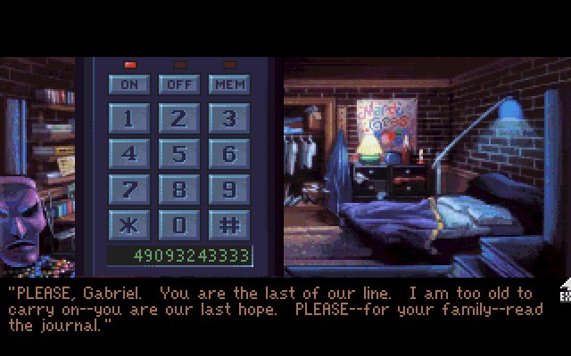 Дождавшись, когда профессор наконец сделает паузу, Габриэль обещает ему сегодня же первым делом приехать в университет, где он сможет всё рассказать более подробно. Завершив таким образом разговор, он просит свою помощницу разузнать о методах передачи сообщений при помощи гаитянских барабанов, а сам идёт в свою комнату - изучать древний дневник своего предка, который прислал двоюродный дедушка Вольфганг.