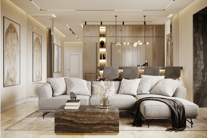 В премиум-интерьере все начинается с фактуры. Камень, дерево, текстиль, металл — не просто элементы отделки, а носители настроения. Главная идея — естественность и плотность.