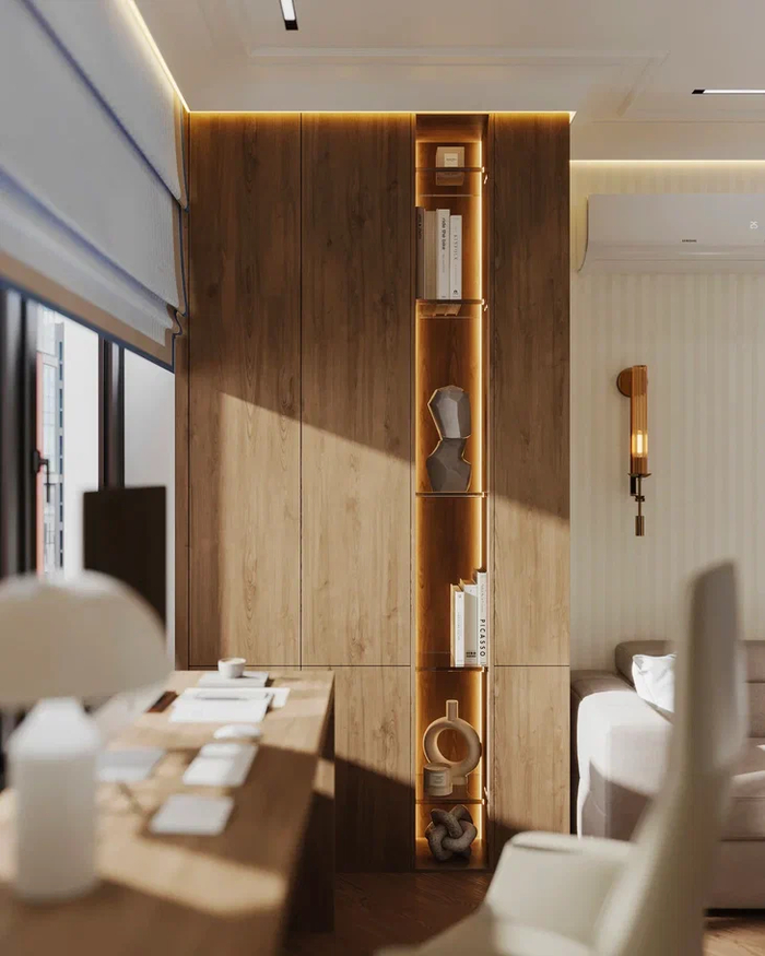 Шпон и дерево не должны спорить с мрамором или текстилем — они создают фон. Это не значит, что интерьер становится скучным. Напротив: мягкий рисунок шпона дает глубину, а не пестроту. Важно, чтобы все материалы работали одинаково — приглушенно, равномерно, сдержанно.