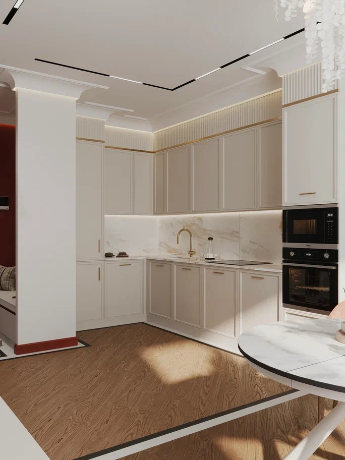 3. Детали. Премиум-дизайн живет в мелочах. Именно они делают проект законченным. Щелчок дверцы, мягкий ход ящика, стык паркета, аккуратная подсветка. Эти нюансы редко замечают, но именно они создают ощущение дорогого интерьера.