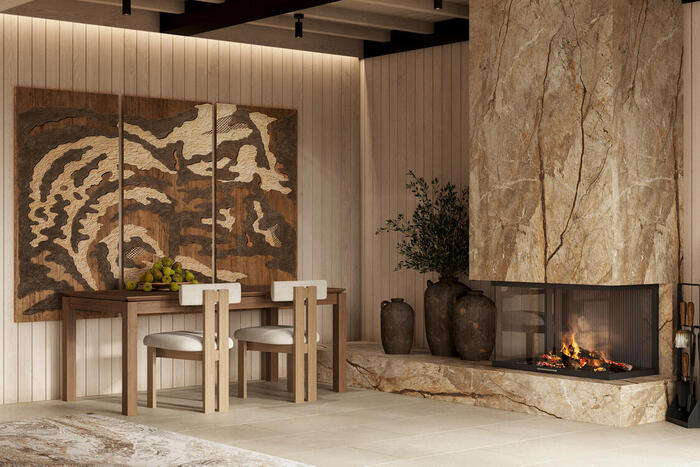 В премиум-интерьере этот тренд выглядит дорого, потому что экологичность теперь — новая роскошь. Натуральные фактуры, структурное стекло, камень, глина, дерево с живой текстурой. Дом становится продолжением природы.