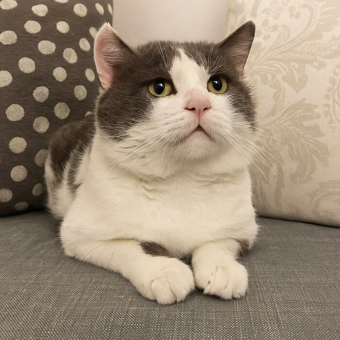 Самый ласковый, доверчивый, нежный, «мамин ребёночек», чудо, а не кот. И его просто невозможно не любить, настолько он трогательный, беззащитный, добрый мальчуган. Немножко трусливый, но при этом всецело доверяет человеку. И буквально не может один.