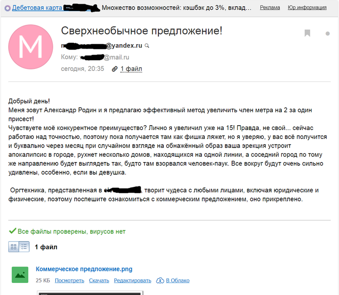 Пришло прямо вот только что. Даже не смог пометить письмо как "спам". И даже руки зачесались открыть файлик. Но не стал.