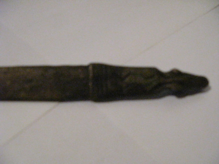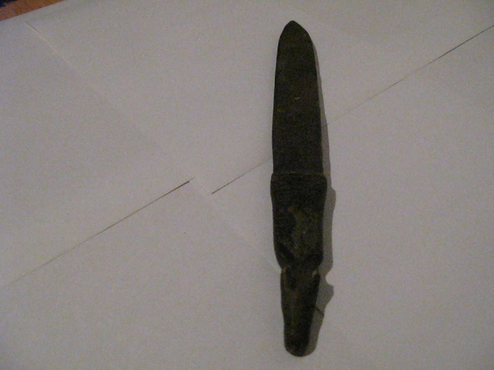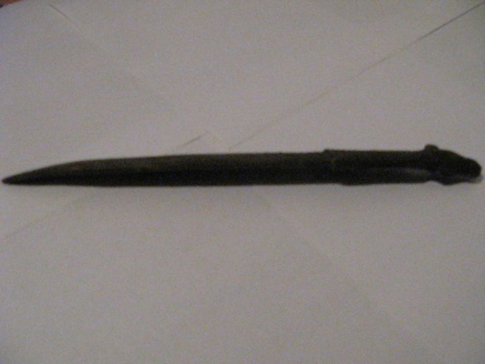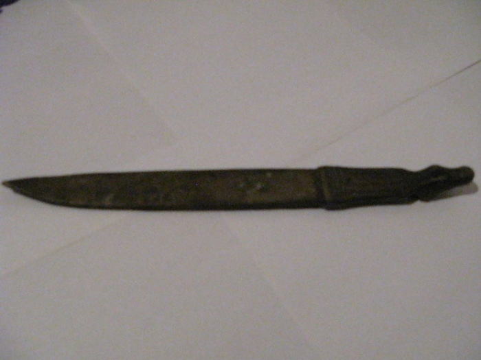 Всем Здравствуйте! Подскажите пожалуйста что это за предмет. Похож на нож но если это рукоятка, то она не большая, в смысле не удобная, сделана в виде лошадинной головы. Предмет изготовлен из бронзы, края не острые.Длинна предмета 24 см., ширина 2.5 см. Буду благодарен всем кто поможет с определением предмета, и его назначением.