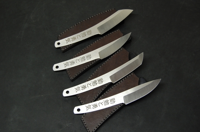 Изготовлены из нержавеющей стали AUS10co. Толщина 3 мм. Спуски прямые, с двух сторон, как у полноценных ножей, сведение 0,1-0,2 мм. Продольная шлифовка всего клинка, вместе с голоменью и рукоятью. Скелетный тип, так как рукоять и лезвие сделаны из одной полосы стали и не имеет накладок, формирующих полноценную рукоять.