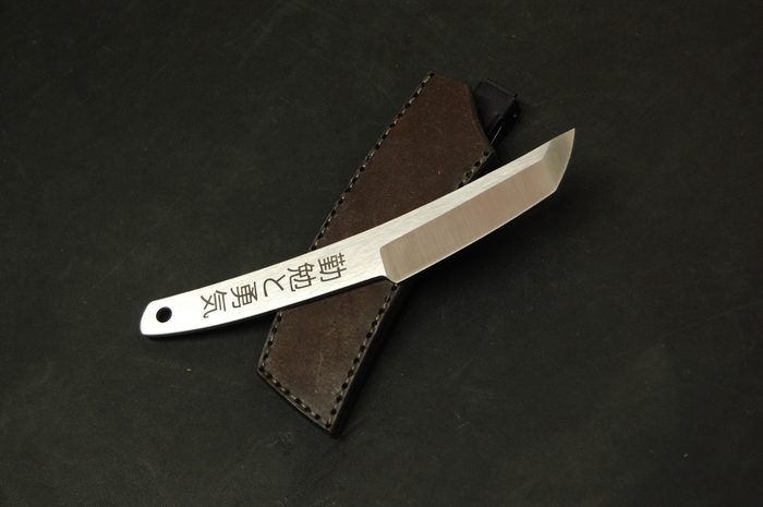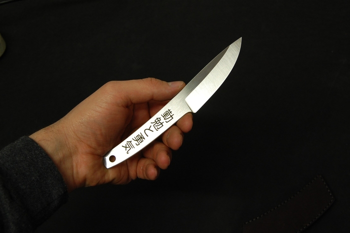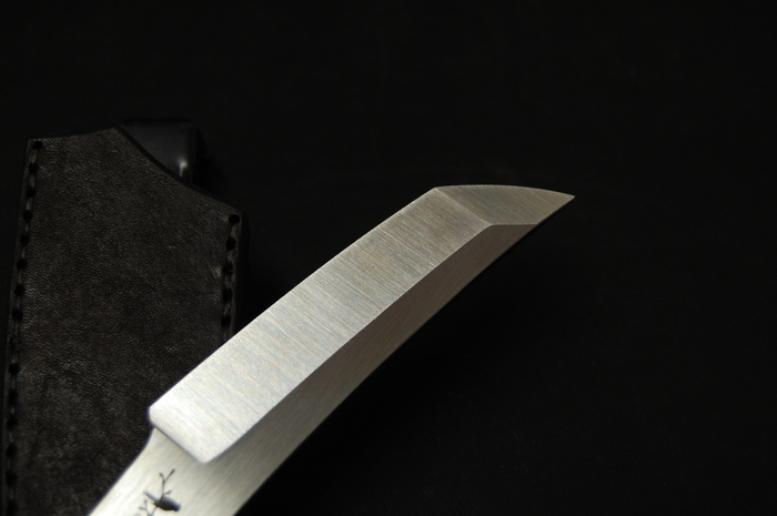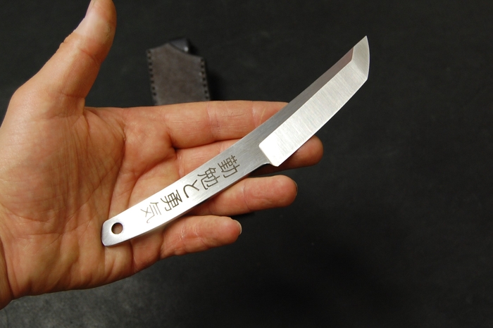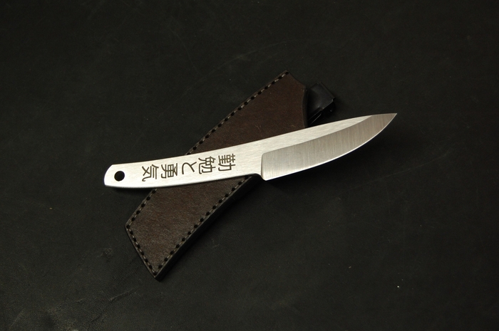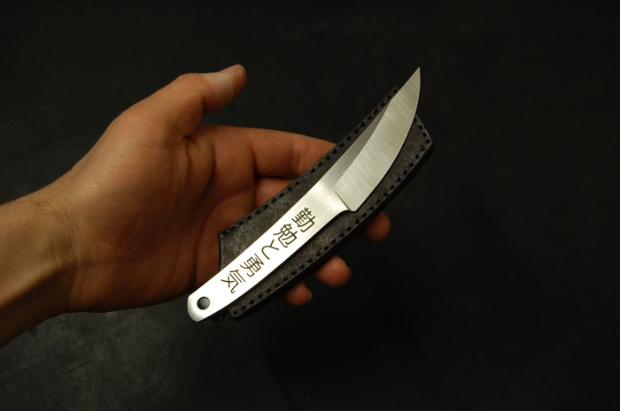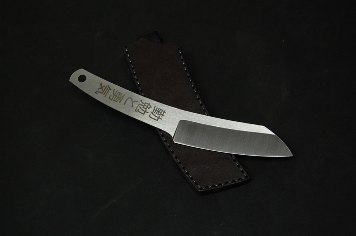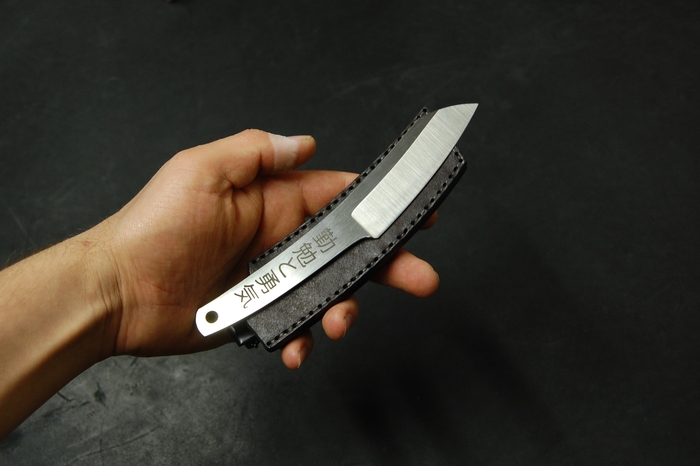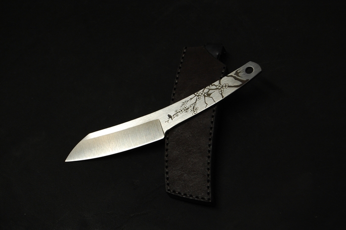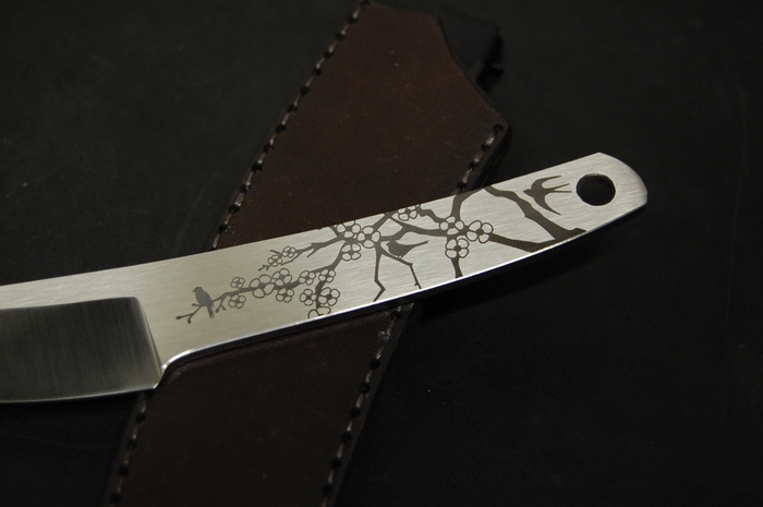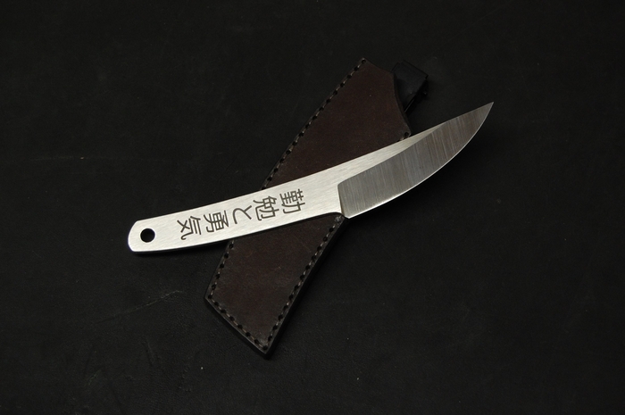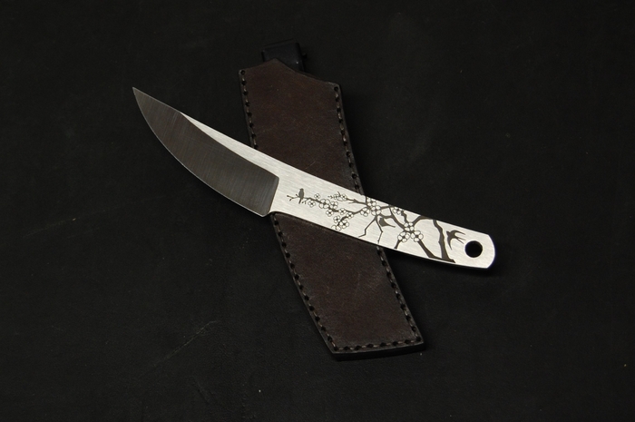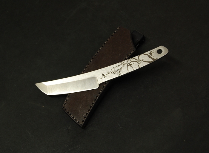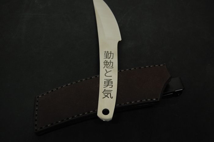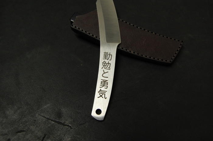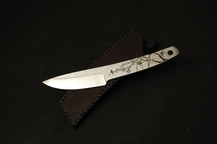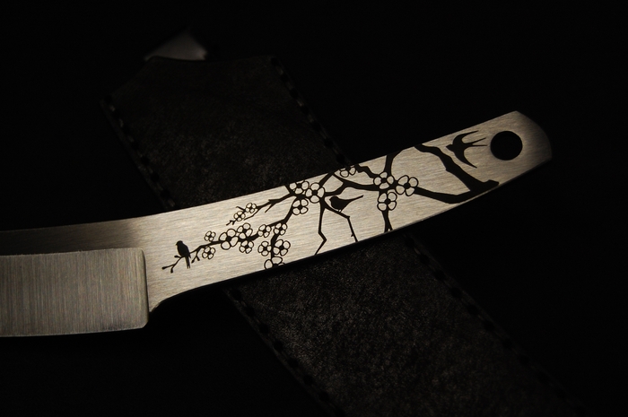 Для красивого внешнего вида сделал лазерные гравировки на рукояти. С одной стороны это пейзаж с сакурой и птичками. С другой надпись иероглифами. Они переводятся как "трудолюбие и смелость". Так же добавил отверстие 6 мм, для упрощения намотки шнурка на рукоять, что бы было удобнее при активной работе. Или для темляка, кто такое использует.