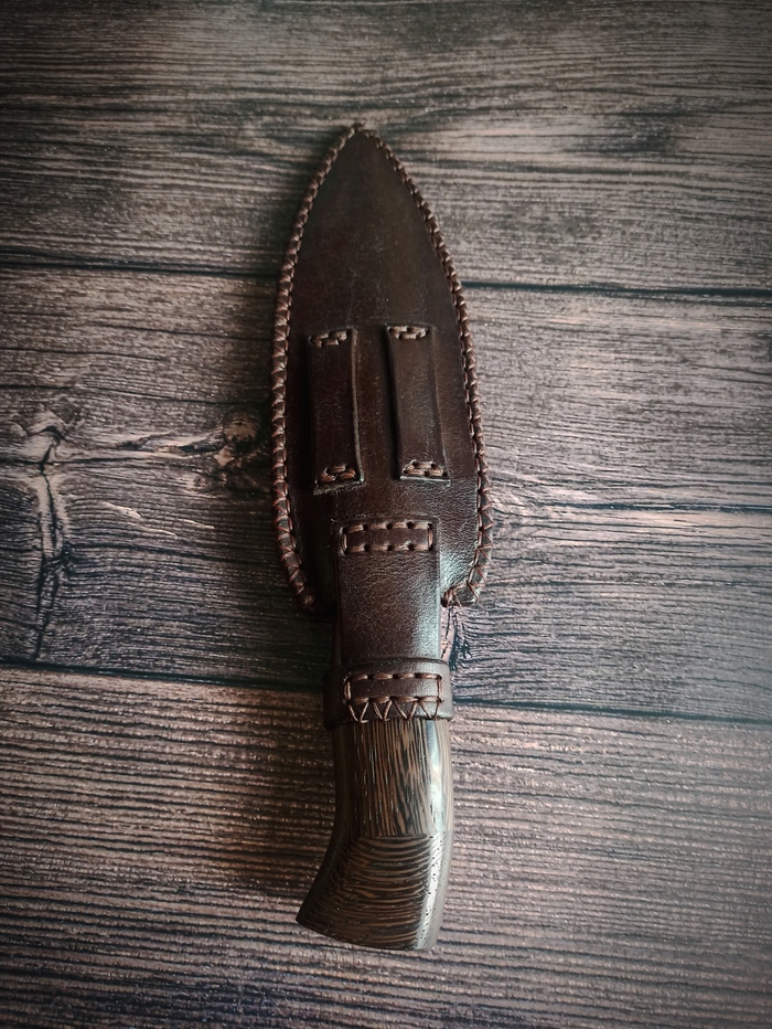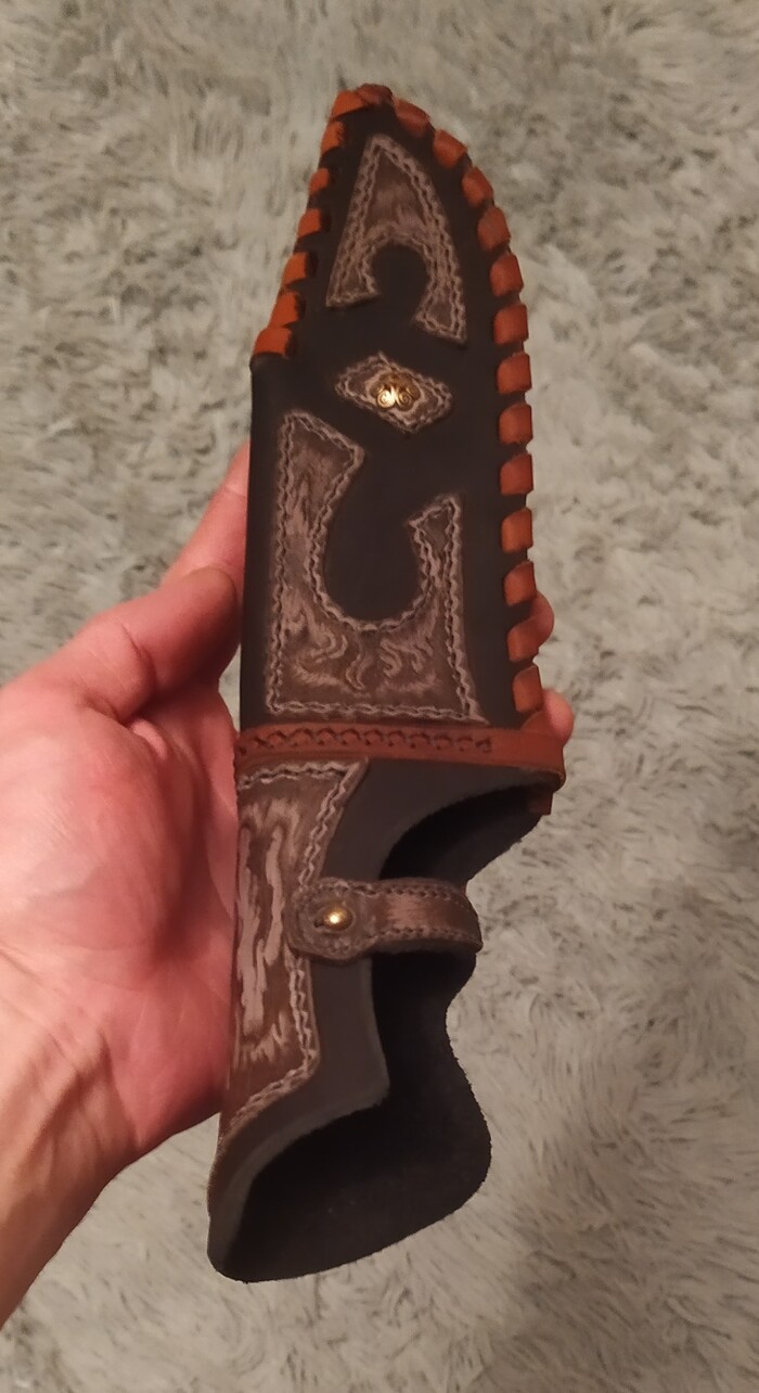 Сделал ножны, сотрудник попросил. В процессе понял что делать выкройки не моё. Хоть всё и сидит плотно, но хлястик не фиксирует нож... Как с этим бороться не придумал.