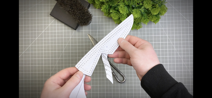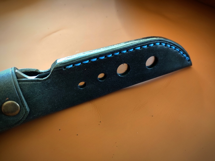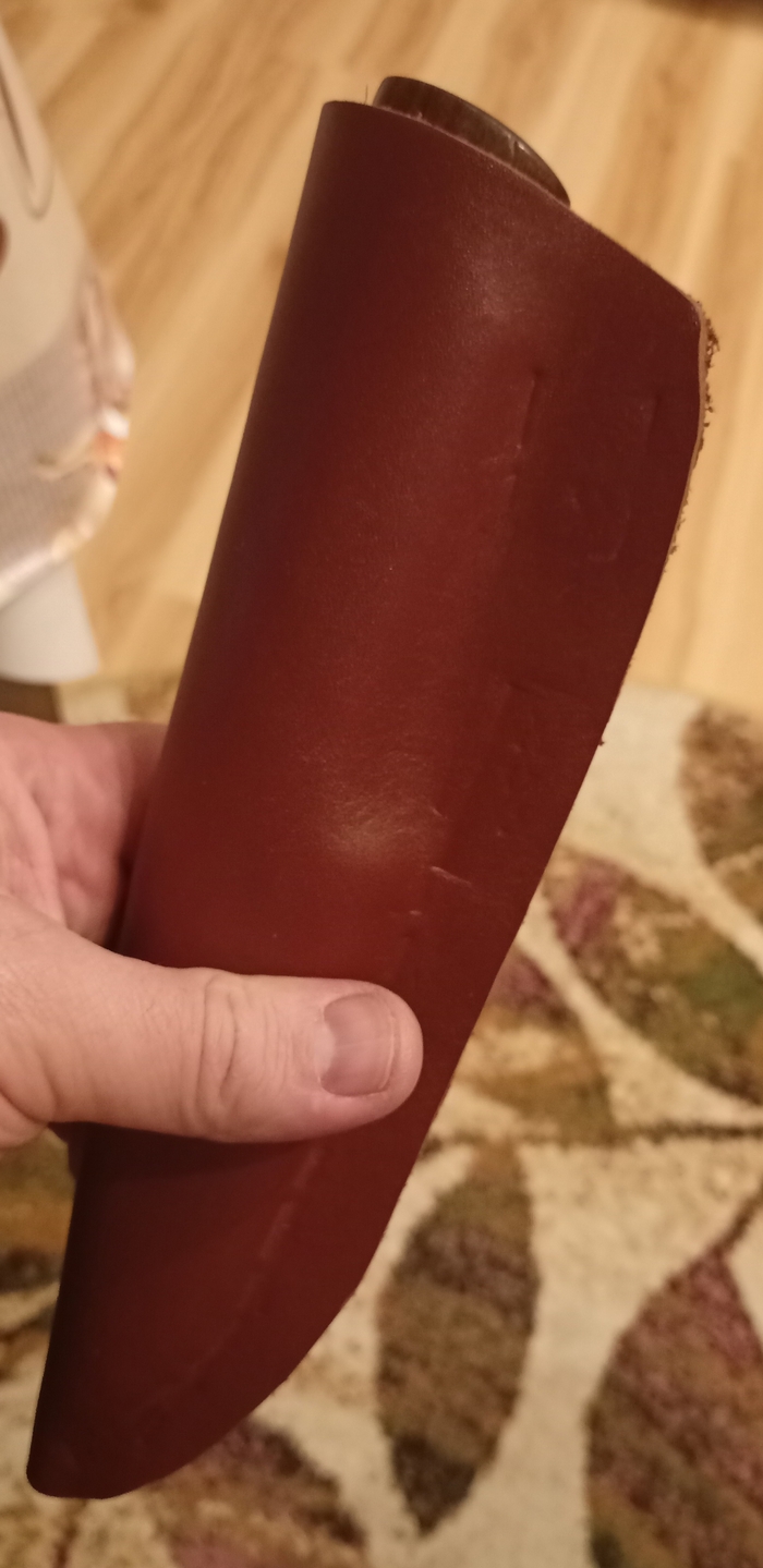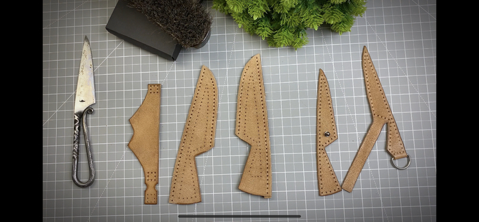 С этими ножнами, для коллеги по работе, я возился долго... До этого шил для ножей с плоской рукоятью, и всё получалось, а тут у товарища рукоять круглой, сложной формы. А так как лекала я придумываю сам, то пришлось придумать аж 4 штуки.