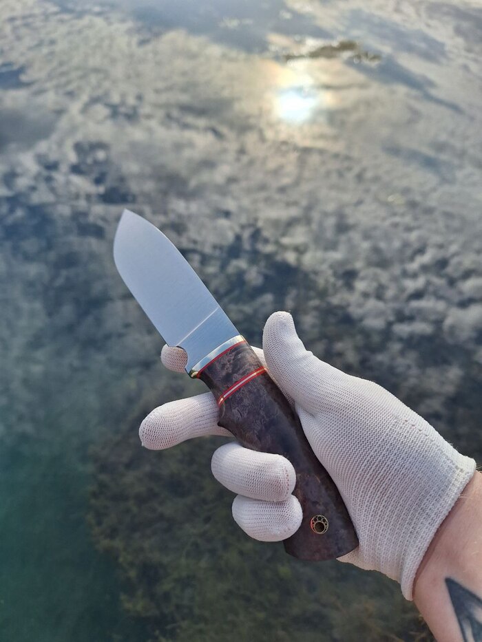 Материал рукояти: Карельская берёза (Коричневая), проставки Мельхиор (1мм), и G-10 (1мм).