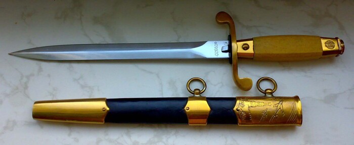 Классический эталон, известный с 1820 года. Общая длина — около 40 см, длина клинка — 27,5 см, ширина — 2 см. Отличается строгим, сдержанным оформлением в морской стилистике.Офицерский сухопутный