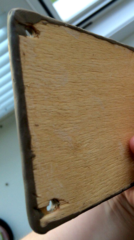 Сразу стал вопрос крепления. Подруга выбрала вариант с саморезами, так что мы сразу высверлили в дощечке четыре сквозных отверстия по углам: