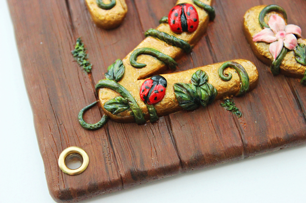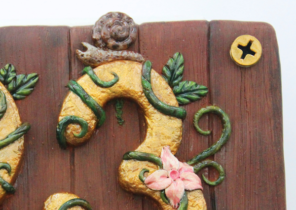 Фон-заборчик я сделала матовым, очень приятным на ощупь, и покрыла матовым лаком. А вот цифры, лианы с живностью и экспериментальный мох я покрыла глянцевым лаком.
