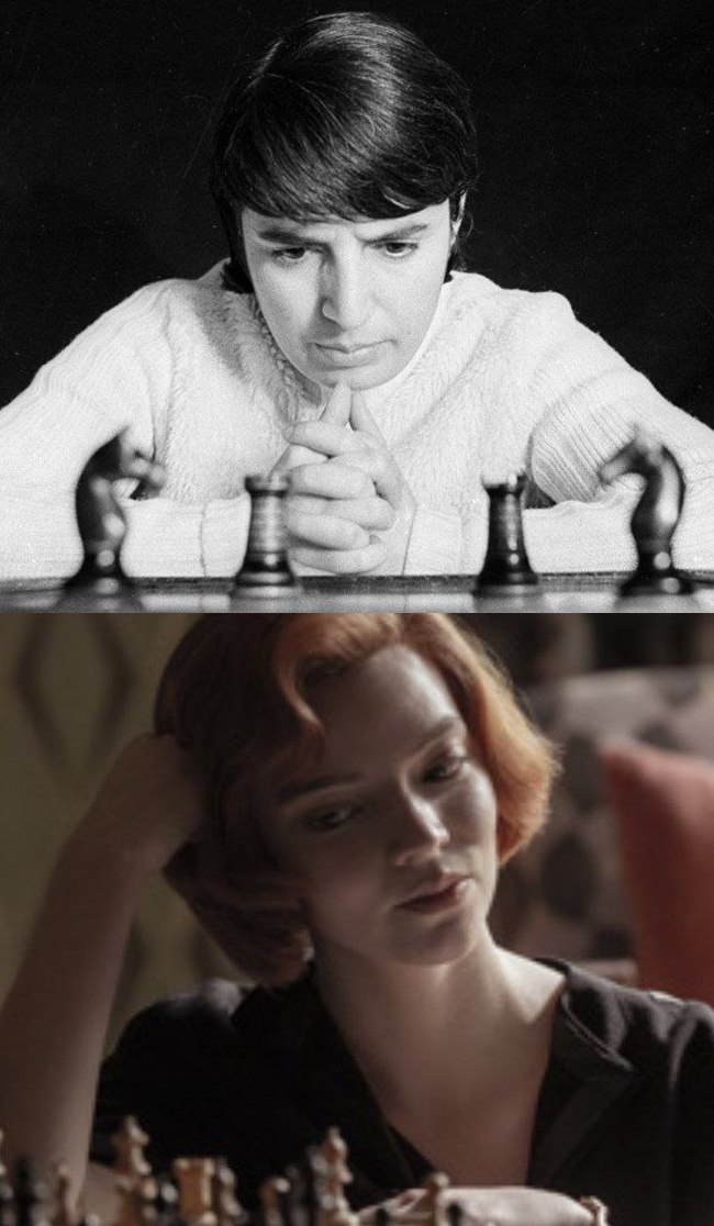 В последнем эпизоде, когда героиня Тейлор-Джой, шахматистка-вундеркинд Бет Хармон играет в напряженном матче 1968 года в Москве против претендента-мужчины, комментатор говорит: «Единственное, что в ней необычно, — это ее пол, но даже это не является чем-то уникальным в России. Есть Нона Гаприндашвили, но она чемпионка мира среди женщин и никогда не играла с мужчинами».