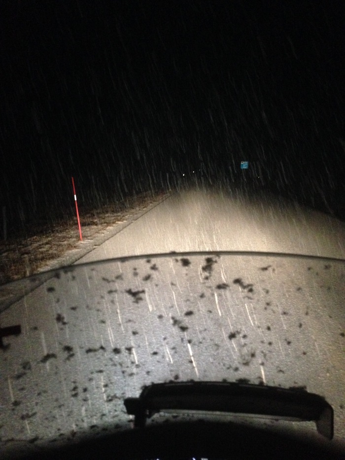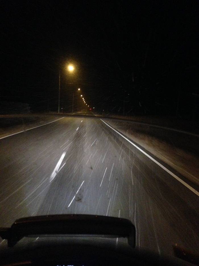 Окончательно стемнело, через дорогу начали щемиться всевозможные божьи твари — жирнющие лисы, наглые олени, приходилось следить за знаками с прыгающим оленем и быть предельно внимательным. Умный человек бы встал на ночлег, но нет, мы же лютые, мы валим дальше. А между тем то, что вечером было мокрым, стало скользким. Солью тут не посыпают, поэтому двигался 40-50 км/ч, стараясь не откручивать газ.