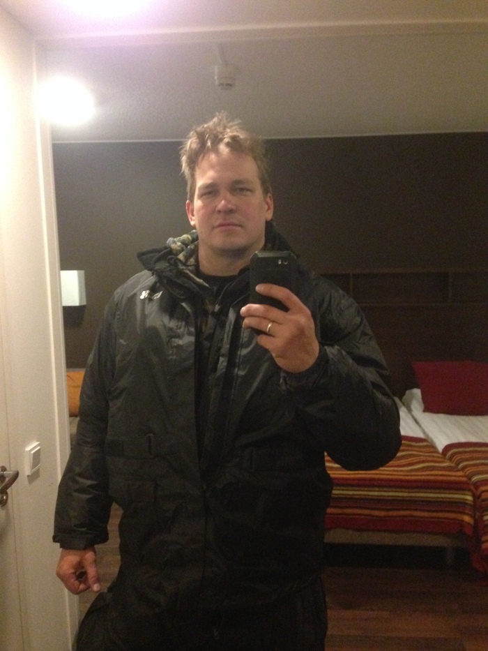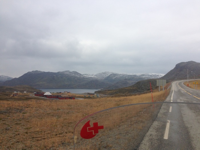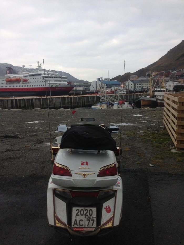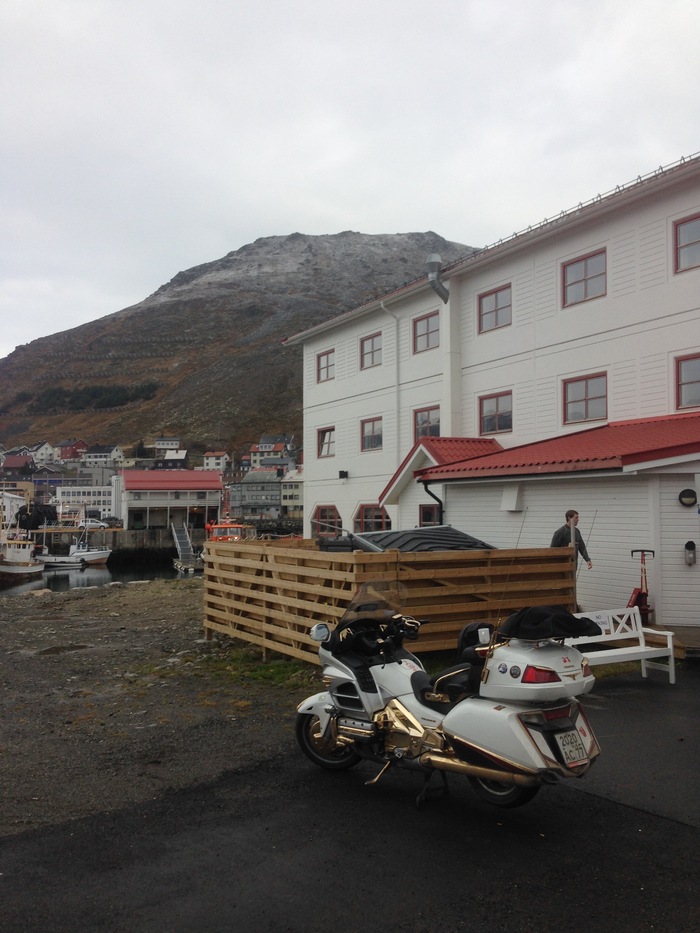 По прибытии в крайний к Норд Каппу город Хоннингсвог (населенные пункты дальше есть, но я был там впервые, поэтому выбрал по букингу то место, где можно было найти ночлег с круглосуточным заселением. В районе шести утра я упал на кровать в одной из небольших гостишек и забылся тревожным сном. Но перед этим надо было видеть лицо тетки на ресепшн! Ко входу подкатывает кусок снега (этот эффект усиливается белым цветом мотоцикла), внутрь заваливается еще один кусок снега. Дождевик замерз и покрылся корочкой, что придавало мне тот еще видон. Выглядел я как полярник с дрейфующей льдины. Думаю, дело во влажности, ведь дорога идет вдоль моря, поэтому и холод ощущается иначе, а лед покрывает мотоцикл и водителя. Так вышло, что дошел до этой точки я за 40 часов с учетом ночлега в 1400 км от Москвы и с поправкой на погоду, которая сделала из меня и мотоцикла Елло Пукки, или как там наш Дед Мороз у них называется. Общий пробег за эти 40 часов около 2400 км