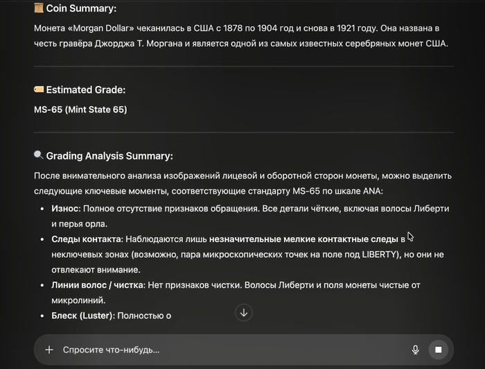 Всем привет! Занимаюсь нумизматикой уже какое-то время, и недавно наткнулся на интересную штуку - энтузиаст на Reddit обучил ChatGPT оценивать состояние монет. Решил проверить, насколько это вообще работает.