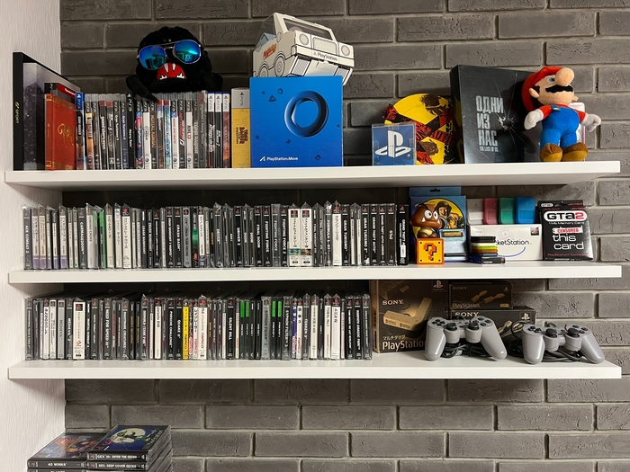 Одна из PS1 у меня с 1997 года (SCPH-5502, как можно догадаться), остальное на фото собрано за 9 месяцев. Увы, не всё поместилось, все PSOne и некоторые джойпеды остались за кадром.Всё началось как раз с японского Dual Analog - SCPH-1150: купил, т.к. хотел такой с момента его выхода и понеслось) Вибрация на нём довольно убогая, но сам джой, по моему мнению, удобнее дуалшока. Почти все плойки пришлось чинить, сейчас работают отлично и читают всё. На верхней полке затесались игры PS3 и PS5, в том числе пресс-киты. Сотня пираток из девяностых также сохранилась, но такого интереса для меня не представляет, поэтому на фото только лицензия разных регионов. Как-нибудь выложу остальные PlayStation, SNES и GameCube. P.S.