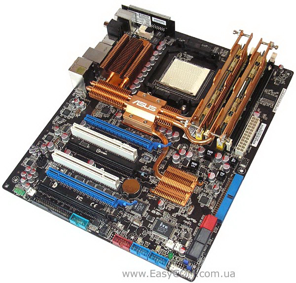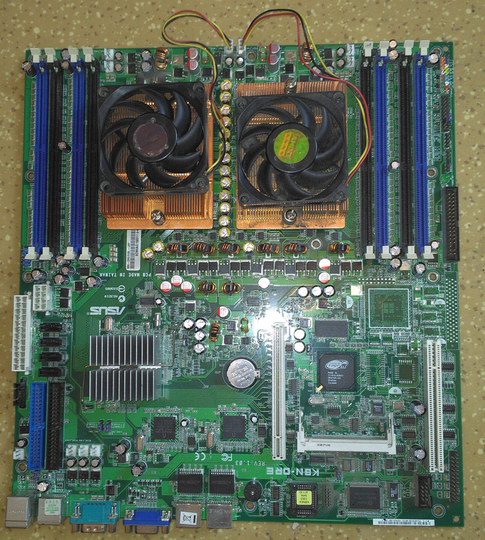 Это двухпроцессорная плата ASUS, в ней стояли два процессора AMD Opteron 280 Socket 940. Для стандартных жестких дисков есть 2 коннектора IDE, а также несколько портов SATA. Встроенного звука нет. Но есть PCI-Express, поэтому я сразу стал подыскивать подходящую видеокарту.