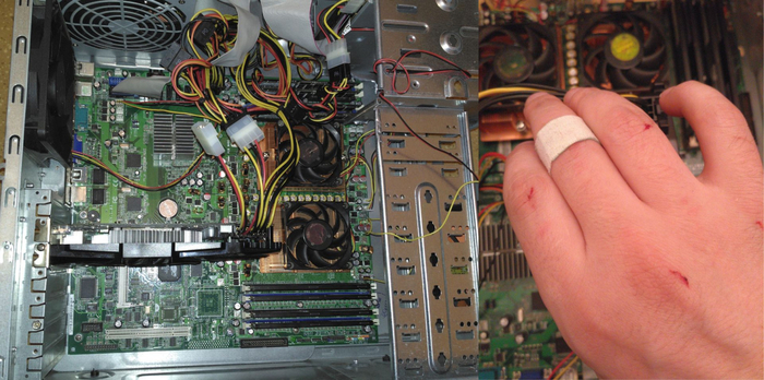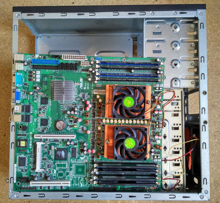 Я заглянул внутрь. Из ящика, среди заросших паутиной проводов на меня глядела плата внушительного размера с двумя огромными медными радиаторами, ощетинившись слотами для оперативной памяти. Больше из-за паутины ничего видно не было. Это явно плата для сервера, двухпроцессорная, с 8 слотами оперативки. Мне стало интересно, что это за материнка и что с ней произошло, целая ли она? Пусть в качестве современного сервера она уже не потянет. А что если...? Мне хотелось узнать, насколько она подойдет для современных программ и повседневных нужд обычного пользователя.