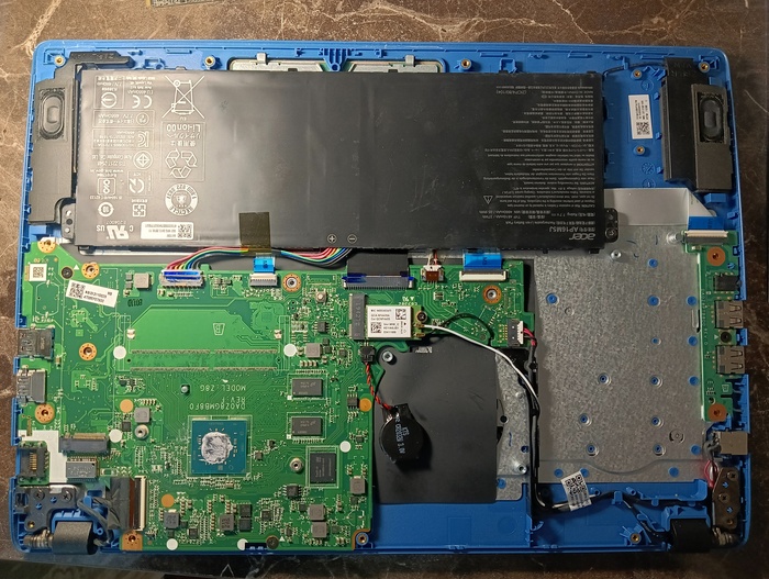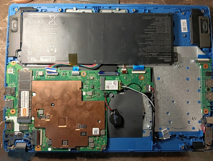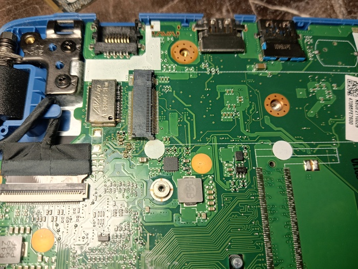 Итак, на ноутбуках acer a114-32/31 установлены накопители emmc, которые имеют свойство помирать. Есть несколько вариантов решения проблемы - 1. выпаять emmc чип и установить другой, рабочий. На озоне можно купить б/у чип на 128 Гб в пределах 1000 рублей +/- 200 р. с учётом доставки. 2. Можно купить переходник на ngff nvme, поставить его вместо платы wifi, а в него уже установить купленный на том же озоне накопитель ssd nvme 2230 на 128 Гб. Ничего паять не нужно, а для интернета в usb разъем поставить usb wifi адаптер их полно и в ДНС и на озоне и на Вайлдберриз за весьма небольшие деньги. Плюс данного способа - ничего паять не нужно. Ниже его опишу. 3. Припаять разъем ngff 67 pin. Для него есть место на плате, как, впрочем, и для других компонентов. Так же понадобится обвязка из резисторов и конденсаторов. Накопитель SSD SATA m.2 (nvme прикрутить не удалось) подробнее опишу ниже. 4. Можно припаять спец разъем под спецшлейф для sata SSD 2.5", место есть и для разъема и для самого накопителя, возможно придется убирать перегородки крышки.