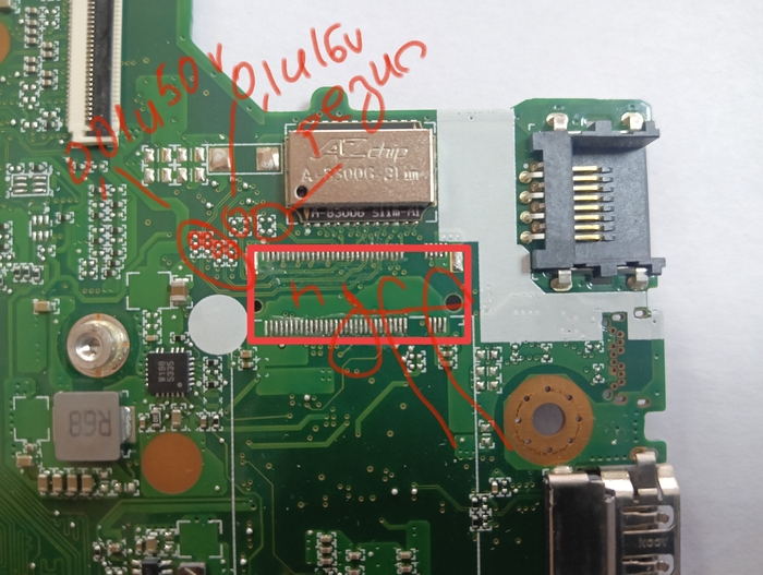 Для припайки разъема под sata m.2 нужны следующие компоненты - сам разъем ngff m.2 67 pin, конденсаторы 0.1u 16v 2 шт., резисторы 0 5% 2 шт., конденсаторы 0.01u 50v 4 шт. Размер на али 0402. Я покупал электросхему на эту серию ноутбуков, данные оттуда. Конденсаторы 0.1u 16v не нашел, купил 0.1u 25v, это не критично. Куда припаивать отмечу на фото. Припаял достаточно всрато, так как сначала припаял разъем ngff, а потом вручную паяльником припаивал кондеры и резисторы, надо было наоборот - паяльной станцией припаять компоненты, а потом разъем.