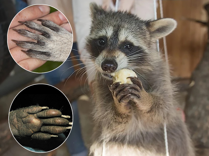 Столь развитые «ладошки» нужны еноту для осязания, и оно у него великолепное. Благодаря множеству нервных окончаний на пальцах енот может находить пищу в темноте, «изучать» предметы и различать их формы и текстуры. Кроме того, развитые пальцы помогают лазать по деревьям, а енотам, живущим рядом с жилищем человека – открывать двери, форточки и крышки мусорных баков.