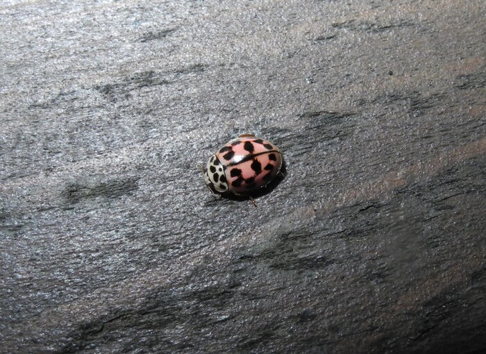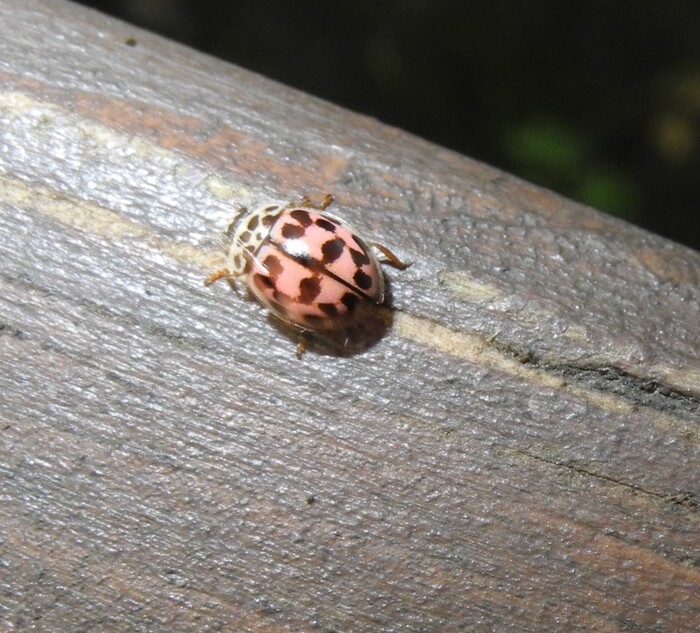 В ходе уборки в дальнем углу обнаружил в пыли засохший трупик божьей коровки - и вида, который до этого не фотографировал. Впрочем, мне, как биологу, для этого не так важно, живой или мертвый объект - не говоря о том, что описание всех видов в основном делается по мертвым экземплярам. Так что представляю коровку четырнадцатипятнистую (Coccinula quatuordecimpustulata), также называемую кокцинулой четырнадцатиточечной.