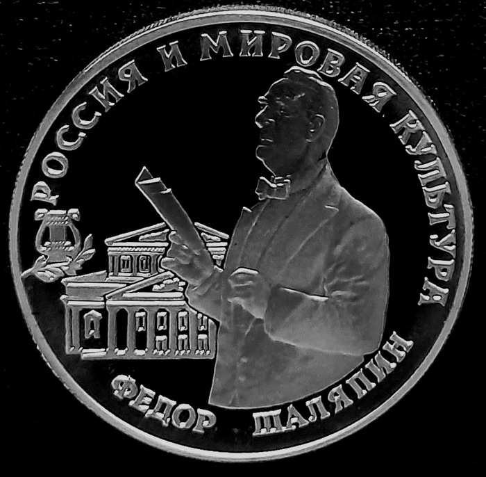 Эта монета выпущена в 1993 году в рамках серии «Россия и мировая культура». На монете изображение Фёдора Шаляпина на фоне Большого театра в Москве, слева: лира и лавровая ветвь.