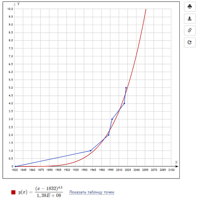 Исходя из предоставленных данных, путём подстановки сложного математического анализа графика количества переименований Астаны по времени, если тенденция никак не изменится, то следующие переименования столицы Казахстана придутся (ориентировочно) на: