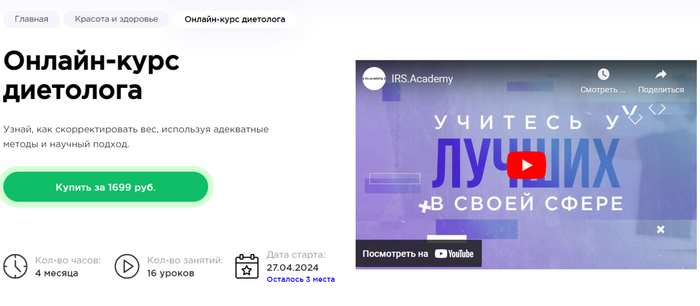 Диетология от Международная Академия Бизнеса — данная платформа предлагает бесплатное пробное занятие. Слушатели смогут получить навыки диетолога, а также диплом о профессиональной переподготовке.