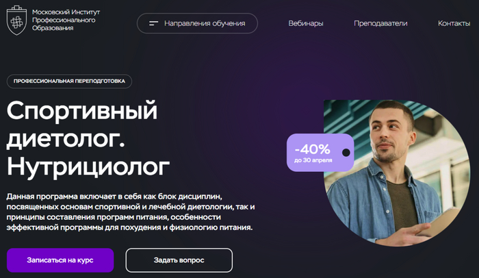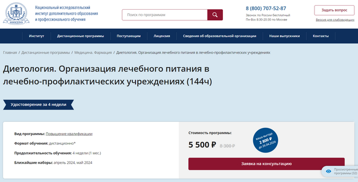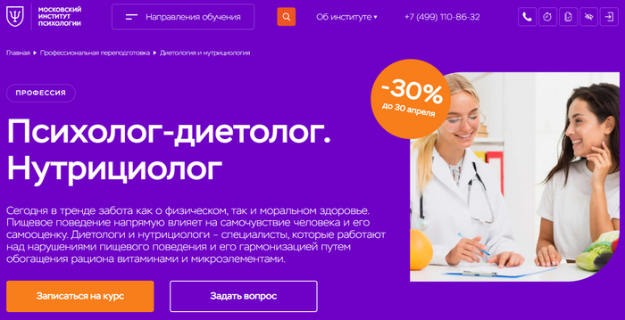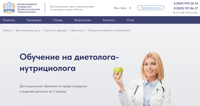 Диетология от МАКПП — обучение проводится по программе, соответствующей ФГОС, предусмотрено бесплатное вводное занятие. Преподаватели рассмотрят основы диетологии, познакомят с политикой здравоохранения в РФ. Предусмотрена выдача диплома о профпереподготовке.