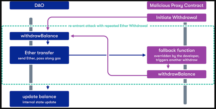 The hacker initiates the interaction with contract Bank through its malicious contract and the sequence of the actions is as follows: