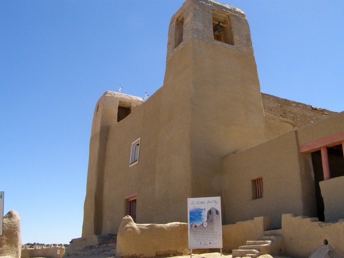 Над этими домишками возвышается католическая церковь San Esteban del Rei, построенная в 1692-ом. Предыдущая была разрушена в 1680 году, когда случилось восстание пуэбло, и падре полетел вниз головой с месы. Церковь тоже из сырца, а роспись внутри представляет собой забавное сочетание христианской и традиционной религий.