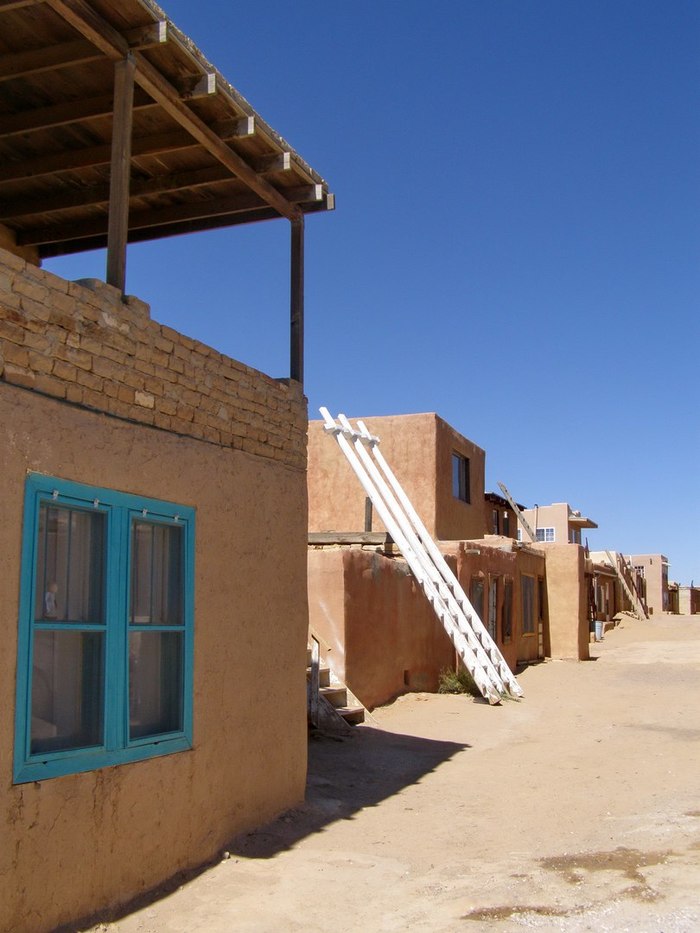 Само пуэбло – это нагромождение примыкающих друг к другу одно-двуярусных домишек (путеводитель сообщил мне, что их насчитывается аж 250), построенных из адобы – перемешанной с соломой глины. В прошлые века попасть внутрь такого домика можно было через крышу, забравшись на нее по лесенке, которая в случае опасности втягивалась наверх. Двери и окна отсутствовали. Теперь индейцам бояться некого, они прорубили на первых этажах и двери, и окна.
