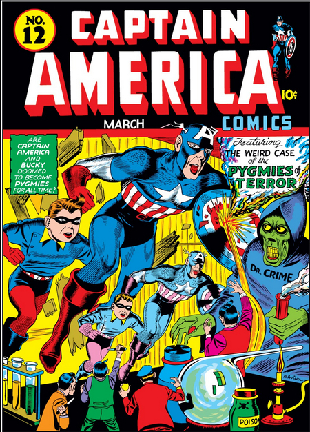 Комикс Captain America Comics #12 начинается с истории «Ужасающая угроза ужасных карликов». Объявляется учёный, доктор Элгрем, который разработал химикат, позволяющий уменьшать живых существ. На него нападает злодей, Доктор Преступность, и похищает химикат и инструкцию к нему, после чего создаёт милипилическую армию «Ужасных Карликов», которые грабят банки и убивают банкиров. Напавших на него Капитана Америку и Бакки Доктор Преступность тоже скукоживает и сажает в вольер к голодной кошке – но герои её побеждают, после чего угрожают насовать Доктору Преступность иголки в уши, если он их не раскукожит. Под зловещей маской Доктора Преступность оказывается доктор Элгрем – он хотел воспользоваться своим изобретением для обогащения, но не прокатило. Разумеется, Стива Роджерса и Бакки Барнса после этого сержант Даффи отправляет убирать территорию, потому что они опять в самоволку ушли.