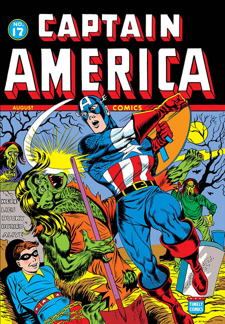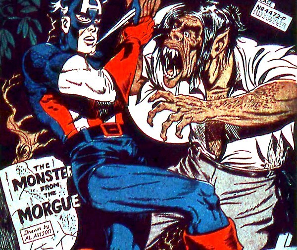 А названия у историй всё интереснее, вот, скажем, первая история в комиксе Captain America Comics #17 за август 1942 года, называется «Монстр из морга». Эх, докодексные времена...жил да был завистливый учёный, доктор Вейрдлер, и узнал он, что его коллега создал сыворотку, позволяющую оживить мёртвые тела, и вознамерился опробовать её на горилле. Обзавидовался Вейрдлер и предварительно пересадил в башку гориллы мозг погибшего преступника, Убийцы Коула. А эксперимент провалился, горилла не ожила и её закопали. А потом в могилу ударила молния, убийца в теле гориллы выбрался из могилы, освободил из зоопарка ещё двух горилл, сколотил из них банду и отправился убивать судей, которые отправили его на электрический стул. А расхлёбывать всё это пришлось Капитану Америке, который сразился с Убийцей Коулом на крыше небоскрёба, и с этой крыши убийцу в полёт и отправил. А доктор Вейрдлер раскаялся и прикрыл Кэпа собой от брошенного убийцей Кэпу в спину ножа. Доктор погиб.